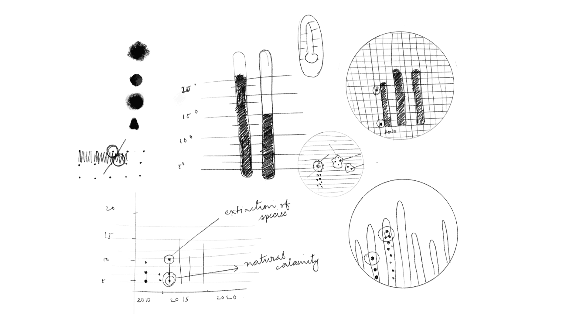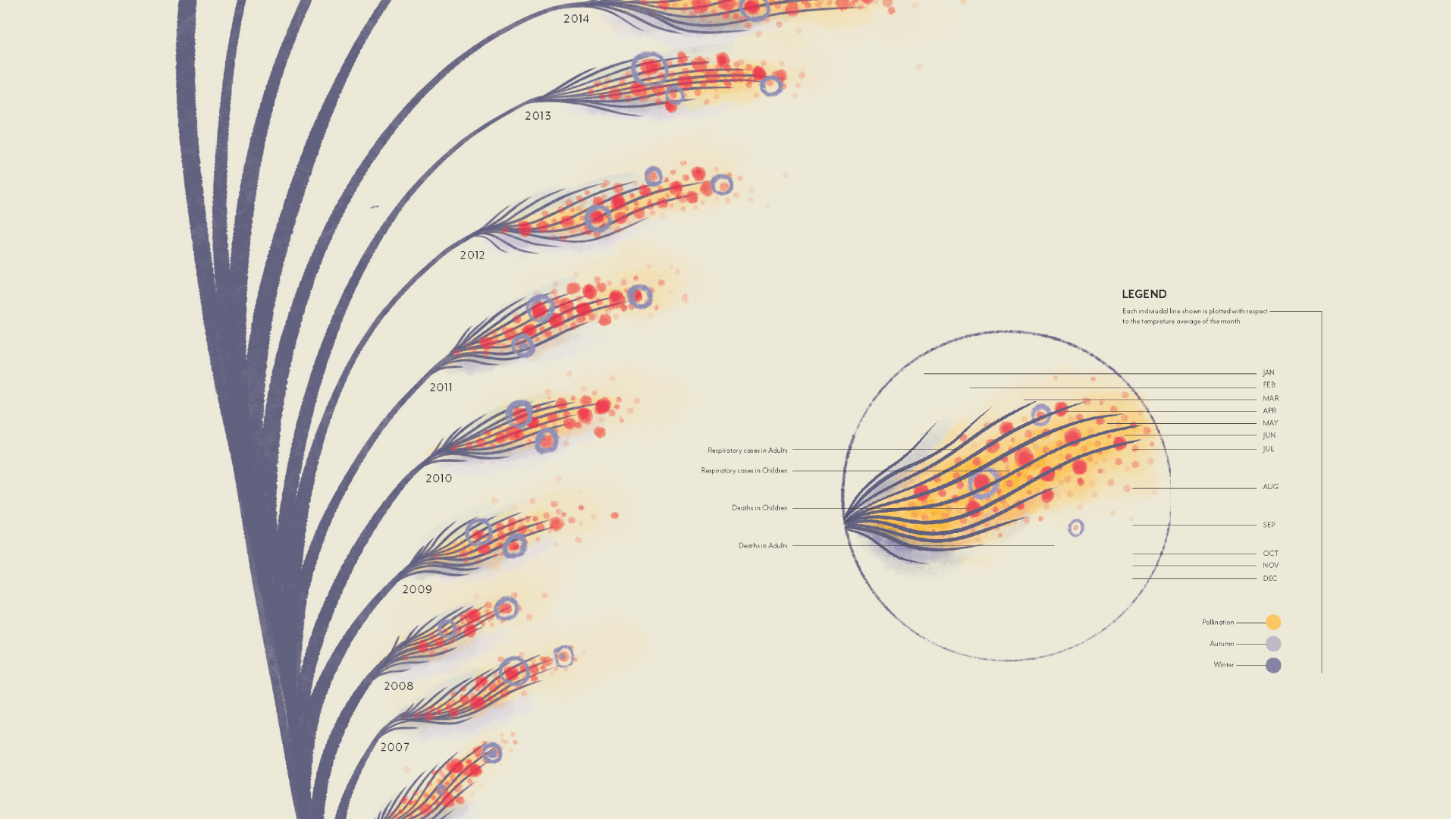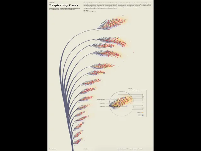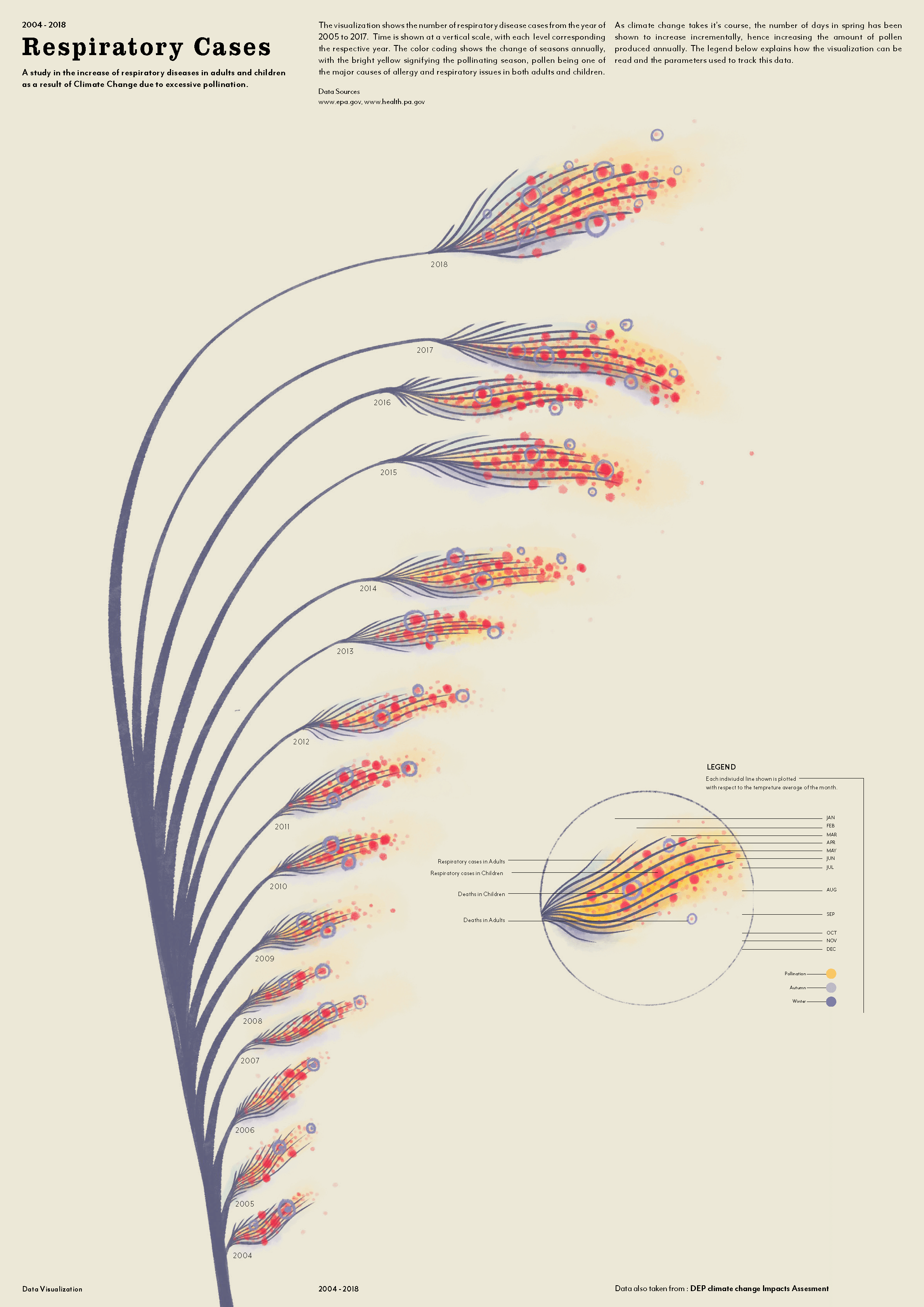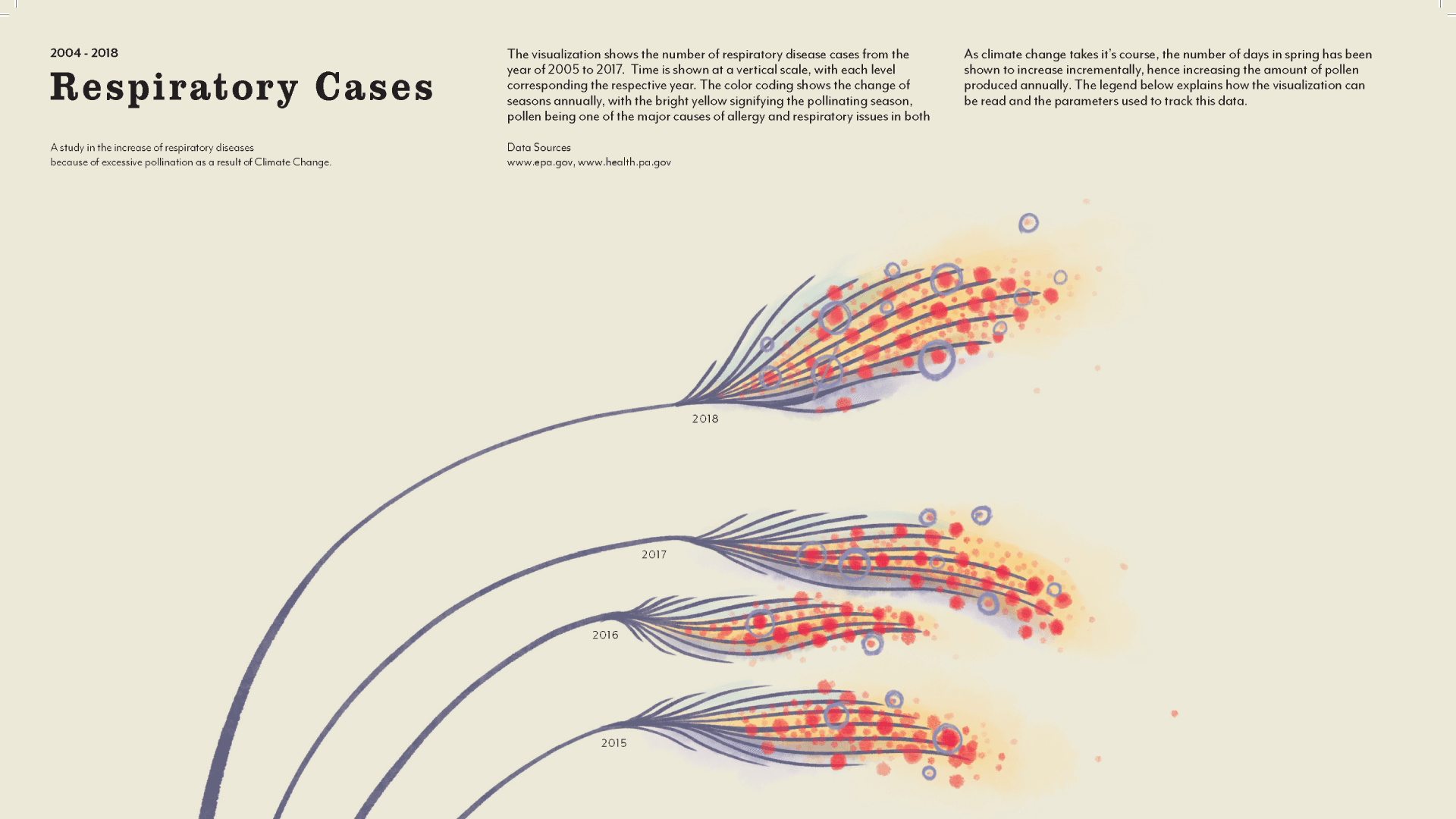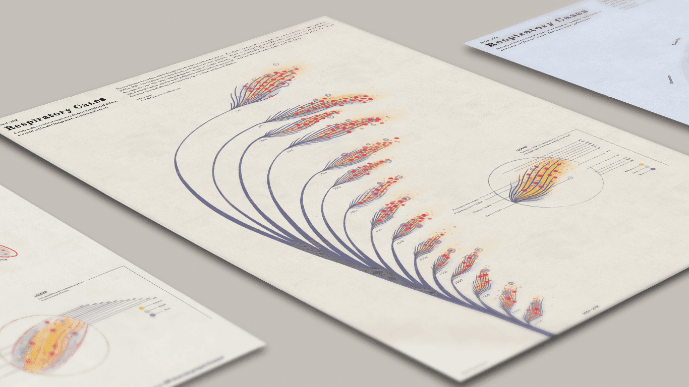 During sketching and prototyping, I tested multiple visual iterations to balance clarity and emotional resonance. Final visuals combined hand-plotted elements with digital composition to retain a tactile, human quality. Pastel yellows represented pollen levels, while red accents denoted mortality linked to respiratory issues.